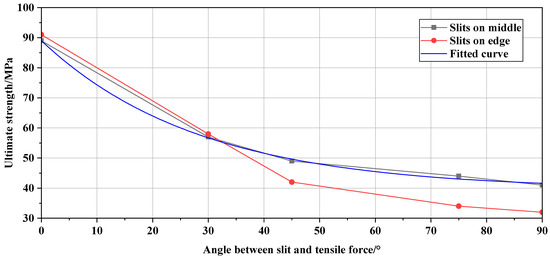 The curve of the ultimate stress versus angle is depicted in Figure 12. It can be observed that as the angle increases, the ultimate stress gradually decreases. The angle plays the main role in the strength of the membrane with slits. Moreover, when the angle between the defect and the tension force is 90 degrees, the bearing capacity is minimal, representing the most unfavorable condition during failure. By conducting fitting analysis on the data represented in Figure 11, it can be observed that the data points align very well with the fitted curve.