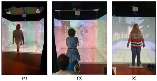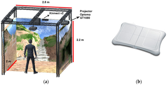 We used a KAVE (Kinect-cave Automatic Virtual Environment) [51], designed and implemented at the NeuroRehabLab, to create an immersive virtual environment for our application. To project a virtual environment display, three white walls were built with a width and height of 2.2 and 2.8 m, respectively. Four HD projectors, external speakers, and a processing personal computer were the core parts of the Kave system (Figure 1a). The KAVE application integrates a Unity 3D plugin comprising scripts, prefabs, objects, and the Microsoft Kinect libraries (https://assetstore.unity.com/packages/tools/camera/kave-113090, accessed on 8 April 2024). Unity 3D is a cross-platform game engine with features such as advanced animations, particle systems, high-definition audio, and tools to create 2D and 3D games. The Kinect V2 tracking sensor (Microsoft, Redmond, WA, USA) was used for full-body tracking to interact with the virtual environment and create a parallax effect.
