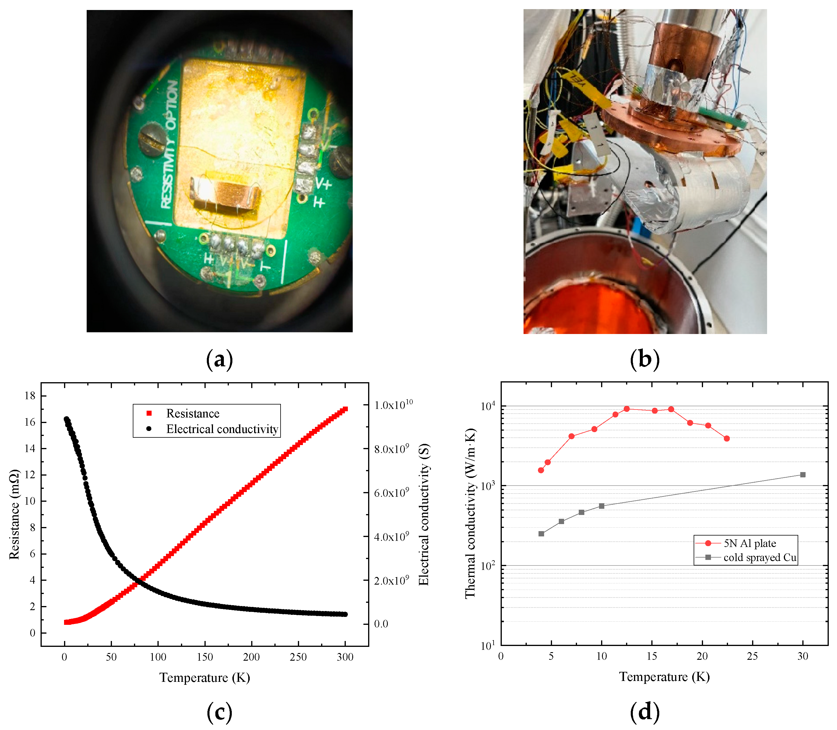 - Dhuley, R.C.; Ruschman, M.; Link, J.T.; Eyre, J. Thermal Conductance Characterization of a Pressed Copper Rope Strap between 0.13 K and 10 K. Cryogenics 2017, 86, 17–21. [Google Scholar] [CrossRef]