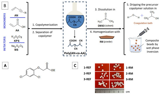 The first component of the composites is a copolymer of acrylonitrile (AN) and acrylic acid (AA), poly(AN-co-AA), notated PAN-co-PAA for convenience. Both monomers, AN and AA, over 99% purity and supplied by Merck (Darmstadt, Germany), were distilled for the inhibitor removal. Copolymerization was promoted using a redox initiation system consisting of potassium peroxydisulfate (KPS, p.a.) and sodium metabisulfite (MS, p.a) (both acquired from Reactivul, Bucharest, Romania) under acidic conditions accomplished with the use of concentrated sulfuric acid (technical-grade, provided by Reactivul, Bucharest, Romania). The preparation of the targeted composite beads also involved the use of specific additional reagents: dimethyl sulfoxide (p.a., Merck, Darmstadt, Germany) for dissolution of copolymers and isopropyl alcohol (p.a., Merck, Darmstadt, Germany) for bead formation by phase inversion. The second component of the composite beads was the RM inorganic filler, which was kindly provided by Alumol Plant (Tulcea, Romania) as a slurry, with the following chemical composition: 41.1% Fe2O3, 1.6% FeO, 17.5% Al2O3, 7.3% SiO2, 5.7% CO2, 3.6%Na2O; 7.5% CaO; 5.2% TiO2, 9.5% H2O; 15.1% residue of calcinations at 1000 °C. Prior to its use, RM was dried and neutralized with CO2 up to pH7. The pesticide, 2,4-dichlorophenoxyacetic acid (abbreviated 2,4-DCFA, chemical structure given in Figure 1A), chosen as a model pollutant to verify the decontamination efficiency of developed composite beads, was provided by Merck (Darmstadt, Germany).
