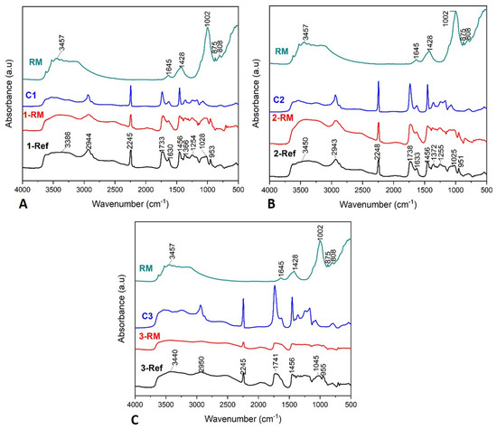 FTIR spectra of analyzed composite copolymer beads compared to RM alone and their corresponding precursor copolymer: (A) C1-based series; (B) C2-based series; (C) C3-based series.
