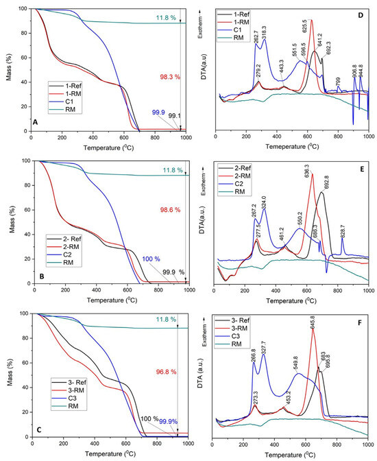 The spectra were recorded comparatively for the composite beads with RM content (1-RM ÷ 3-RM) vs. the reference counterparts (1-Ref ÷ 3-Ref) and the precursor materials (copolymers and RM alone) to determine the effect of the addition of RM on the chemical structure and composition and the importance of the copolymer/RM ration in the composite beads (Figure 2A–C). In the area of low wavelengths, the signals corresponded to the sulfate ions from the redox initiation system, with symmetric stretch ~950 cm−1 [73] (for beads and copolymers) and stretching of S=O from DMSO around 1030 cm−1 (beads) [74], and overlapped with the signals in RM corresponding to the Si-O-Al bonds (~1000 cm−1) in all the spectra of composite beads (1-RM, 2-RM, and 3-RM).