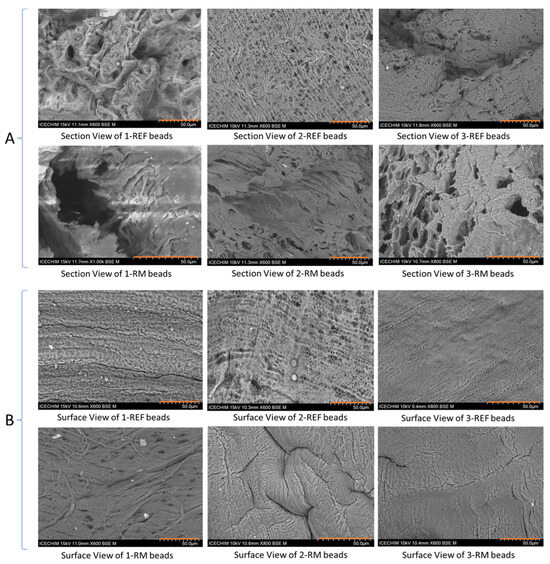 To obtain information regarding the effect of RM on the morphology of the samples, SEM images were recorded at a 50 µm scale in section and surface views for both reference and composite beads (Figure 4). The micrographs in Figure 4A show that using RM changes the composite beads’ surface and inner pore structure. Samples with lower amounts of AA (5% for 1-RM and 10% for 2-RM) in the copolymer matrix present heterogeneous pore structures and large voids (section view-1-RM) and alternating porous and smooth zones (section view 2-RM), probably due to uneven RM distribution in the copolymer matrix (as indicated by FTIR and TGA determinations). The section view of 3-RM reveals an interesting porous structure of the composite, with smaller smooth zones than 2-RM.