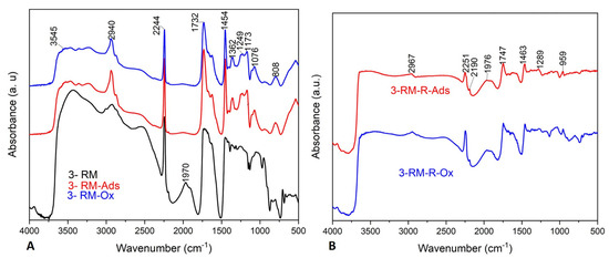 FTIR spectra of (A) 3-RM, 3-RM before and after adsorption (3-RM-Ads)/oxidation (3-RM-Ox) processes; (B) 3-RM after reconditioning from the two procedures (3-RM-R-Ads after adsorption and 3-RM-R-Ox after oxidation).