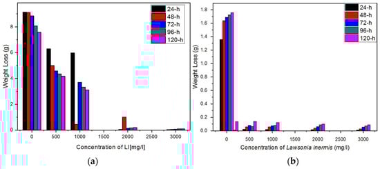 Weight loss versus concentration for mild steel coupons in (a) 0.1 M and (b) 1 M HCl with or without Lawsonia inermis at 30 °C.