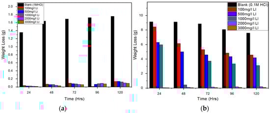 Weight loss versus time for mild steel coupons in (a) 0.1 M and (b) 1 M HCl with or without Lawsonia inermis at 30 °C.