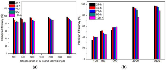 Inhibition efficiency versus concentration of Lawsonia inermis for mild steel corrosion in (a) 0.1 M and (b) 1 M HCl at 30 °C.