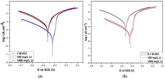 Pdp graphs for mild steel in (a) 1 M and (b) 0.1 M HCl with or without LI.