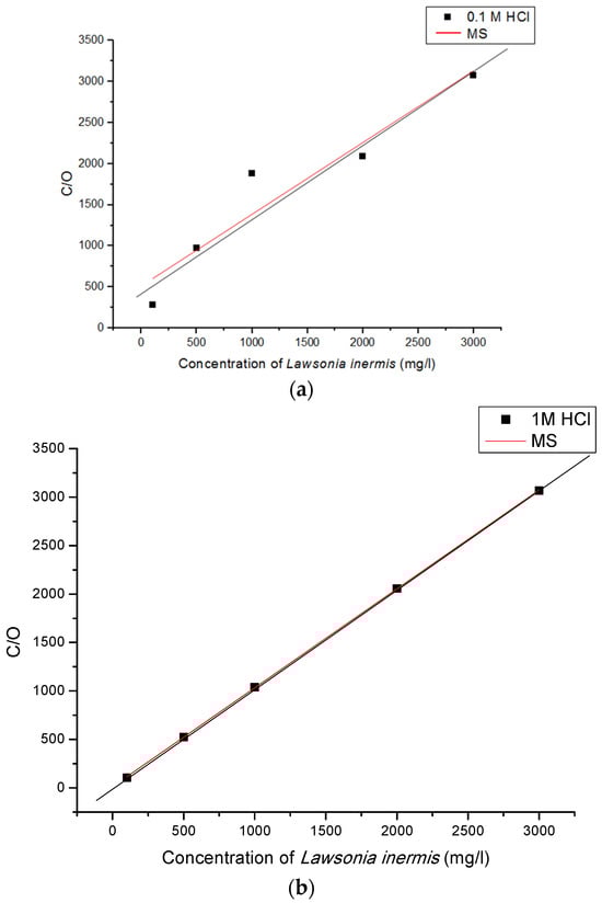 Figure 5 is a plot of versus c, and the linearity of the graph shows that the data are well fitted to the Langmuir adsorption isotherm, although the graph in Figure 5a did not completely fit the Langmuir adsorption model. This could be as a result of significant adsorption between adsorbed molecules or as a result of the heterogeneity of the metal’s surface or multi-layer adsorption on the metal’s surface, which the Langmuir model could not adequately account for.