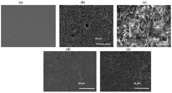 (a) SEM picture of polished mild steel surface; (b,c) SEM photographs of mild steel surfaces dipped in 0.1 M and 1 M HCl; (d) SEM picture of mild steel dipped in 0.1 M HCl containing LI; (e) SEM picture of mild steel dipped in 1 M HCl containing LI.