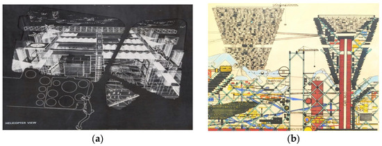 (a) Cedric Price, Fun Palace. (Source: toran, iv. https://www.flickr.com/photos/136374633@N04/23341131945/, accessed on 6 April 2023); (b) Archigram, Plug in City. (Source: Wyliepoon https://www.flickr.com/photos/wyliepoon/49224543288/, accessed on 7 April 2023).