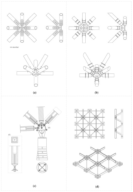- Bamboo connectors (Figure 4a): Ghavami and Moreira [13] developed a joint for the construction of double-layered bamboo space frames from octagonal plates welded to an octagonal base plate. During the research, the joint was tested on a double-layer bamboo space frame prototype with single supports every 4 m. The results were satisfactory. Currently, research is being continued with prototypes of larger spans.