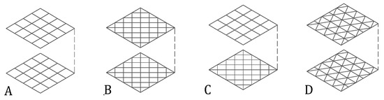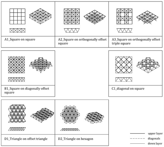 The topology refers to the geometrical order of the bars and nodes. For greater stiffness of the flat spatial frames (indispensable in large spans), two layers are arranged connected to each other through the set of diagonal bars. Although the variety of typology is practically infinite, the present work focuses on those patented and commercialized for use in construction. The use of a custom-designed topology would also involve the design of the construction system of joints and bars, an area that is not the focus of this work. Based on the bibliography [12,17,18,19,20,21], the seven most mentioned and used typologies have been chosen. A classification has been proposed (Figure 5). To order them, each one has been named with a letter and a number to be able to identify them easily throughout the paper (Figure 6).