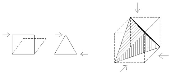 D1—Triangle on offset triangle: created from the grouping of tetrahedral modules. It is the most rigid of the frames, as all the faces of the polyhedron are triangular, the undeformable geometry par excellence (Figure 7).