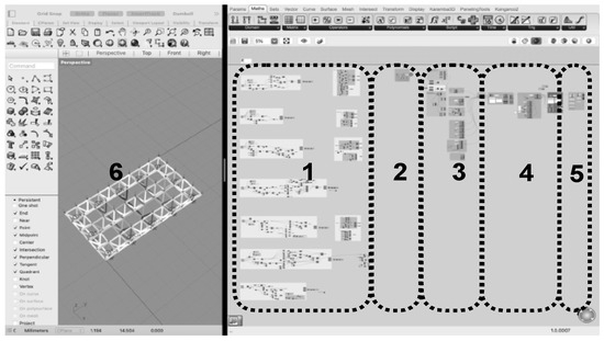 Screenshot of the Grasshopper file. (1) parametric definition; (2) parameters; (3) transformation from geometry to structure; (4) calculation; (5) visualization; (6) rhino viewer.