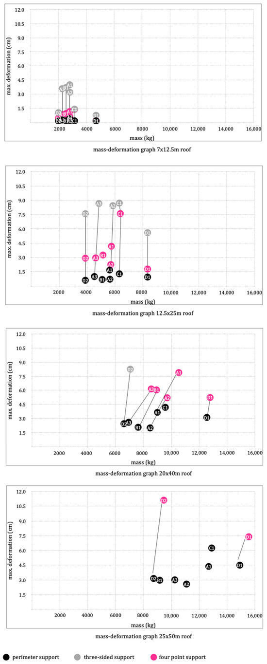 Looking at the topologies individually, the D1 frame is the one with the highest mass in all cases and, at the same time, one of the least deformed. A1 and C1 are the worst performers, as they need a lot of mass without deformations decreasing too much. The others have similar behaviors, although the A2 and D2 frames behave slightly better.