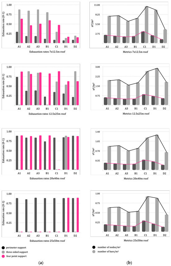 The exhaustion rate is the ratio between the stress supported by the bar and the maximum strength of the material. A maximum exhaustion of 90% has been defined in Karamba. All optimizations have been made on this basis. The columns that do not appear are those that do not meet the calculation requirements. Something noteworthy in the graphs (Figure 15) is the development of the meshes D1 and D2. In 7 × 12.5 m roofs, they are well below the others. As the span is increased, they start to work up to the 90% limit.