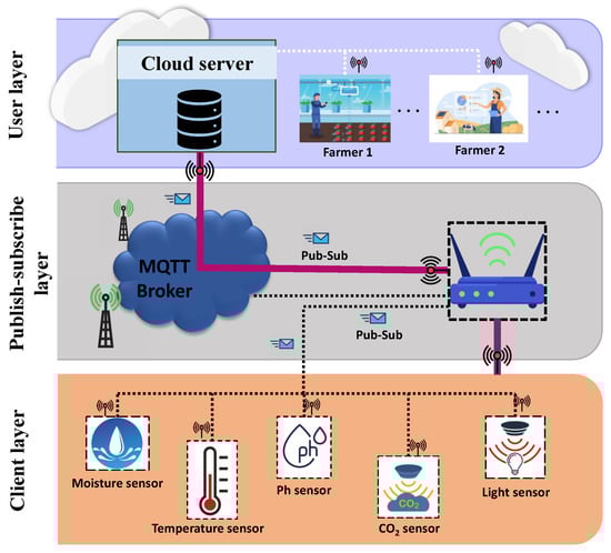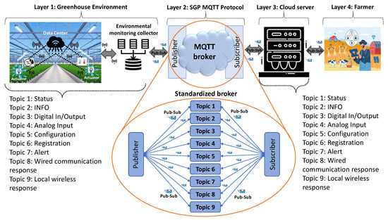 The Internet of Things (IoT)-enabled smart greenhouse is an innovative agricultural system that employs cutting-edge technology to improve crop yield [1,2,3,4]. These systems are a technologically sophisticated variant of conventional conservatories designed to improve agricultural productivity, efficiency, and sustainability. The continuous collection of sensory data from sensors, such as temperature, humidity, light intensity, soil moisture, and other variables, is required to monitor and control environmental variables, considerably enhance the greenhouse’s performance, and transmit environmental information to cloud-based systems. Remaining up-to-date with greenhouse climate characteristics and modifying them to correspond with the requirements of various crops has become a formidable obstacle [5,6,7]. Therefore, it is crucial to establish standardized seamless connections between the cloud infrastructure and IoT systems [8,9]. Similarly, the articles discuss many machine-to-machine (M2M) protocols employed for the transmission of IoT application information. These technologies include Constrained Application Protocol (CoAP) and Message Queue Telemetry Transport (MQTT) [4,10,11]. CoAP is a RESTful platform that employs a request/response structure. It is evolved from the Hypertext Transfer Protocol (HTTP) and developed specifically to adjust to the limitations of restricted systems [12,13]. Nevertheless, in the context of cloud connectivity, a crucial aspect of devices is their ability to autonomously transfer data without being prompted for an additional request. Hence, the MQTT publish–subscribe (pub-sub) system presents the capability to transmit data to the cloud regularly [10,14,15,16,17], without necessitating the reception of a request. In addition, pub-sub structures establish connections between terminals or clients, such as IoT products and cloud platforms, through the assistance of a broker [18]. Pub-sub systems guarantee the transmission of information to the server by employing Transmission Control Protocol (TCP) as the communication protocol [19]. These systems supply two essential components for the messages: the topic, which is an organized list that specifies the context to which the sent data pertain, and the payload [4]. In terms of the topic classification between pub-sub clients and the broker, the establishment of a hierarchical categorization mechanism for messages facilitates the optimization of message routing and processing on the broker’s end. Hence, the unorganized nature of the data presents an appropriate level of adaptability. However, it is important to acknowledge that this flexibility comes with certain limitations. For instance, the size of the topic and payload may range from tens to hundreds of bytes, as demonstrated in the studies conducted by researchers [15,20,21,22]. Additionally, the implementation of a standardized pub-sub structure within the context of MQTT presents a significant challenge, as illustrated by the investigation performed by the authors [4,10,23,24]. The deployment of pub-sub mechanisms through MQTT brokers may be categorized into two distinct types, namely, scalable and non-scalable, depending on the particular requirements of IoT applications. In circumstances where there is an imperative to provide support to a substantial quantity of publishers, subscribers, and messages, the presence of a scalable MQTT broker becomes crucial. In cases where scalability is not a fundamental desire, a non-scalable broker may be adequate for limited installations [25].