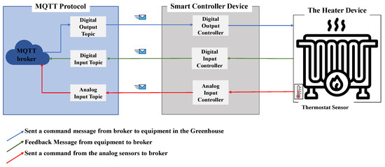 - Digital Input: As feedback from the tools in the greenhouse. Take turning on the heater as an example, whose command is conveyed to the digital output; the command is performed in the first action, and we only see the message of turning on, even if the heater is burned in the greenhouse. It is worth noting that receiving feedback after executing the order to switch on the heater is critical because it demonstrates the correct execution of the command, allowing us to ensure that the heater is in good working condition, as shown in Figure 3.