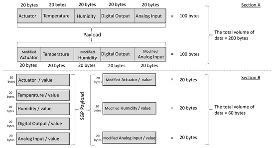 - In the conventional MQTT protocol, the structure of every payload is defined by five topic levels. Each topic level is allocated a data volume of 20 bytes, resulting in a total data volume consumption of 100 bytes for each payload. In contrast, the proposed structure of each MQTT payload designates its allocation to a distinct topic level, with a fixed data size of 20 bytes.