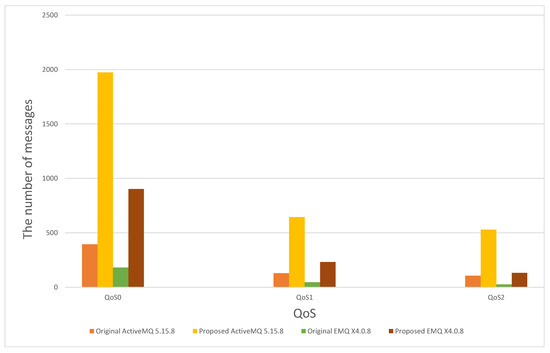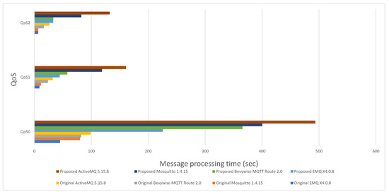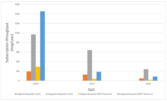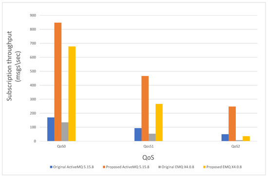 Figure 8 and Figure 9 show the subscription throughput of non-scalable and scalable brokers in both traditional and proposed architecture at all QoS levels, respectively. There are significant changes in the results of our proposed structure for non-scalable brokers by three QoS levels. See Figure 8. Another interesting point is that the proposed Bevywise MQTT Route 2.0 broker has the highest amount of throughput only at the QoS level, while the other broker sees an upward trend at the QoS1 and 2 levels. This means that brokers with higher throughput results subscribe the messages to the brokers at a higher speed and more efficiency. Regarding Figure 9, the proposed ActiveMQ 5.15.8 broker grows more steeply than the proposed EMQ X 4.0.8 at all QoS categories. Meanwhile, the high throughput value of brokers utilizing our proposed architecture compared to brokers with the traditional architecture indicates that brokers can manage a large number of messages simultaneously and ensure that messages are delivered quickly. In addition, a high throughput improves reliability and scalability by effectively addressing message traffic and minimizing the probability of missing or lost messages. In other words, the sign of a high subscription throughput is that the MQTT broker can quickly and efficiently route messages to the appropriate subscribers without impacting the overall performance of the system. This ensures that messages are delivered in a timely and reliable manner, which is crucial for many IoT applications [43,44].