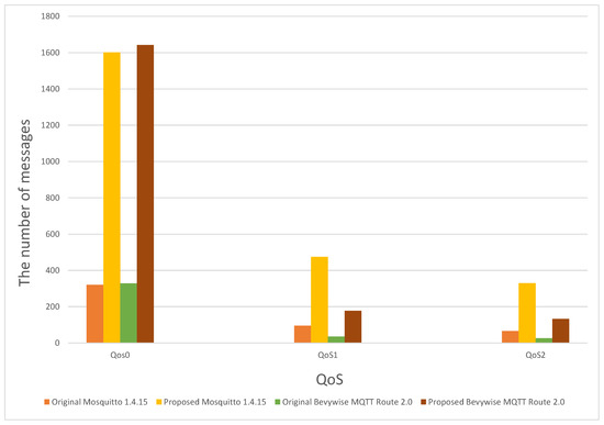 Figure 6 and Figure 7 demonstrate the number of messages in both the original and proposed scalable and non-scalable brokers at all QoS levels. When we look at the message size or data volume that is reduced in the proposed firmware, the number of messages grows dramatically compared to both types of traditional MQTT brokers. For instance, if the two processes of temperature rise and declining humidity in the greenhouse environment are investigated, these two processes with our proposed architecture of brokers have much less data volumes or relatively small message sizes, much greater number of messages in one second, and, even according to Figure 5, more events covered per second.Looking at the specifics, the proposed ActiveMQ 5.15.8 broker has a sharp increase in the number of messages across all QoS levels. Furthermore, there is a gradual rise in the proposed Mosquitto 1.4.15 broker through QoS1 and 2 categories, while the results of the proposed Bevywise MQTT Route 2.0 broker have a considerable jump at the QoS1 level.