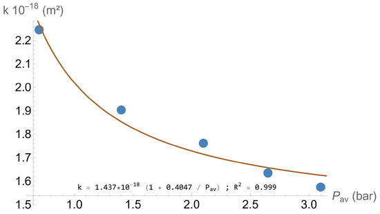 The permeability coefficient for each specimen tested was calculated. With these values, an adjustment was made, and Equation (4) shows the fit equation obtained: