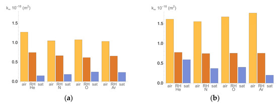 Figure 2 and Figure 3 display the values of k∞ for specimens 135 and 151, grouped by the type of gas used in the test and the type of conditioning. No clear trend can be observed based on the type of gas used, but for helium, the highest permeability value is obtained. Concerning the type of conditioning, the highest permeability value is obtained for dry concrete (air-exposed samples), while the lowest value is obtained for saturated concrete. This can be explained by the availability of pores for gas permeation. The trends for the specimens with cold joints are similar, but the values are higher by approximately two orders of magnitude.