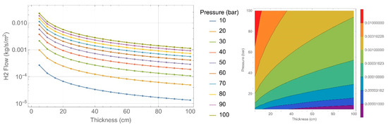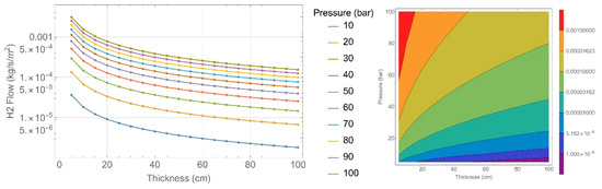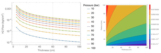 To observe the effect of thickness and internal tank pressure, hydrogen flow has been plotted on a logarithmic scale (Figure 7, Figure 8, Figure 9, Figure 10, Figure 11 and Figure 12). The left side of each figure shows a 2D diagram, and the right side depicts the same in a contour plot.