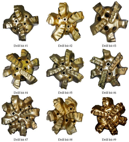 The structures of these above nine types of PDC bits are shown in Figure 1, where #1 to #7 are 8½″ bits, bit #8 is a 6″ bit, and bit #9 is a 12¼″ bit.