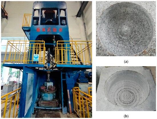 Drilling experiments were conducted on a 300 kN full-scale bit test bench with the above nine bits, and the rotating speed was set to 60 rpm. By applying WOB, the drilling bit working torque, penetration rate, and other parameters were analyzed, respectively. The intrusion depth of the bit under each experimental condition was converted according to the intrusion rate and rotating speed parameters, thus forming a characteristic intrusion depth versus torque relationship. The experimental equipment and the bottom hole formed by drilling are shown in Figure 2.