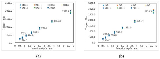 It can be seen from the figure that the working torque of the PDC bit has little influence on parameters such as tooth distribution density and blade number, and the torque difference of various types of bits is <7% under the same invasion depth. The characteristic intrusion depth–torque curves in rocks of different strengths increase linearly, but with the increase in rock strength, they exhibit a positive correlation trend, demonstrating that rock strength has a significant influence on the torque characteristics of PDC bit drilling.