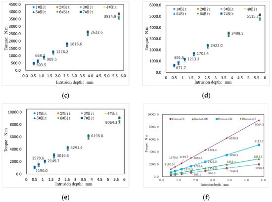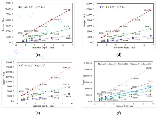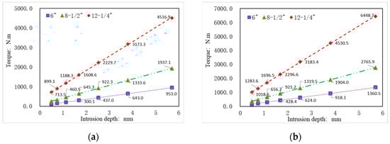 Experiments with PDC bits of different sizes (6″, 8½″ and 12¼″, respectively) were conducted. The characteristics of the invasion depth–torque relationship are shown in Figure 4. The strength of rock blocks in five strata gradually increases.