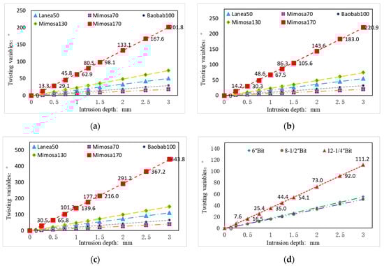 It can be seen from the figure that the most obvious torsion variable is that of the 12¼″ bit, followed by 6″ and 8½″ bits after the penetration depth of PDC bit changes. In particular, the torsional variation of the 12¼″ bit in the Minmosa 170 (compressive strength = 175 MPa) rock block reaches 443.85° (1.23 cycles) when the penetration depth reaches 3 mm.