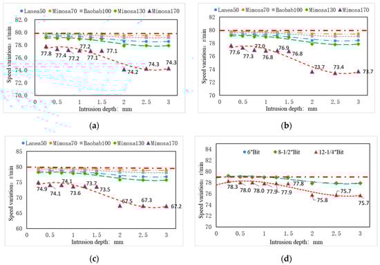 Taking the 8½″ PDC bit as an example, we see that this type of bit has the least influence on the speed fluctuation owing to the change in penetration depth compared with that of the 6″ and 12¼″ bits. A longitudinal comparison of different lithologic changes, such as an intrusion depth of 1 mm, from the Lanea50 formation block to the Mimosa170 formation block reveals that the change in rotational speed per unit time is 2.14 rpm.