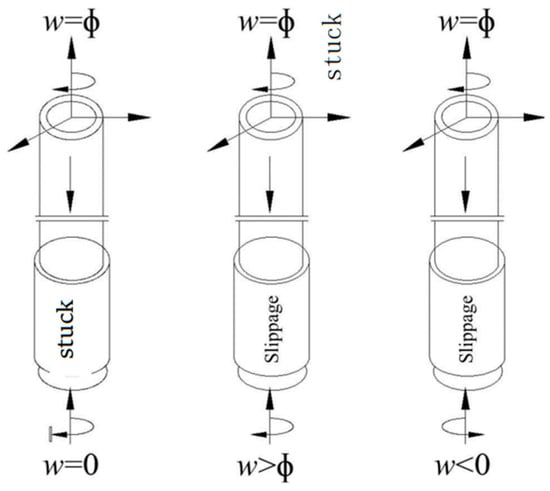 SV of the bit appears alternately as evident by bit viscosity and slippage. In the viscous stage, the drill bit decelerates and rotates while the drill string system continues to rotate under the drive of the turntable, resulting in distortion. The most direct manifestation of the accumulated energy of the drill string is the rapid torque load. In the slippage stage, when the torque buildup at the tip–rock contact becomes enough to drive the bit to break, the drill string energy instantly releases the forward rotation of the bit and suddenly accelerates the bit penetration rate several times faster than the rotating speed and torque of the rotary table. Figure 8 shows a schematic diagram of SV of the bit, in which the bit speed is the rotary table speed.