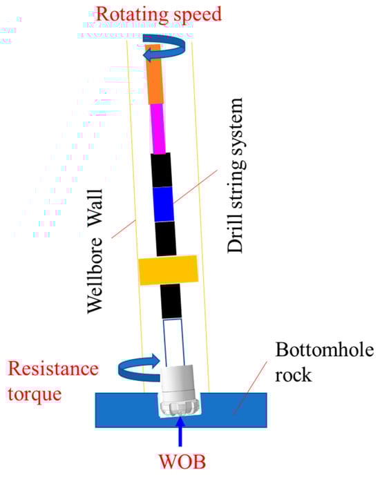 The fundamental reason for SV of PDC bits is that the fluctuation of bit working torque leads to the instantaneous change in the bit rotating speed. With the rotation of the drill string system, this energy is stored in the form of elastic deformation. When this deformation reaches a certain degree, it is enough to overcome the rotation retardation of the rock on the bit, and this energy will be released instantaneously in the form of a cycle of SV. Therefore, the torsion variable of the drill string system is important in the relationship between torque and speed. A structural schematic diagram of the rock–bit–drill string system is shown in Figure 5.