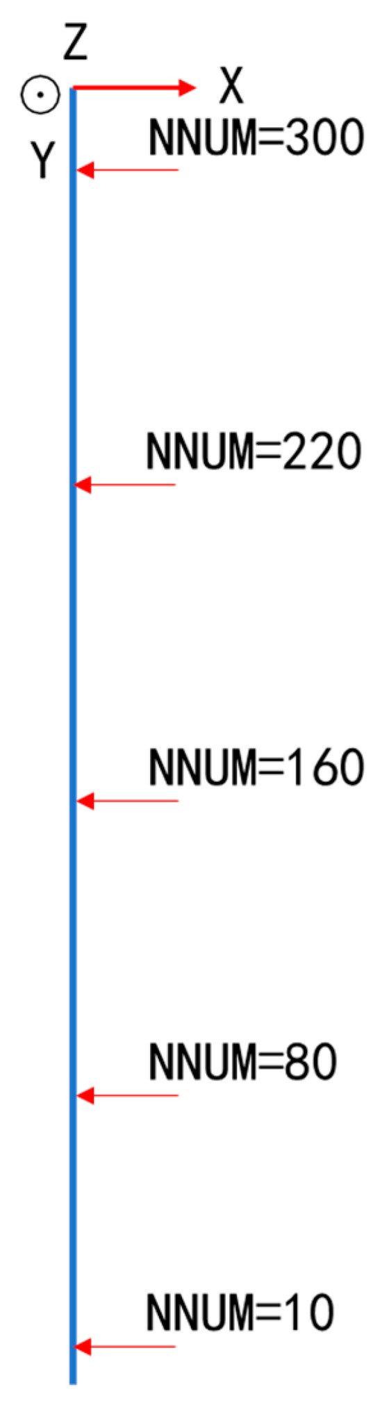 Figure 9 shows the structure of the drill string system. Figure 10 shows that the total number of unit nodes was 300 per 10 points and one meter of unit nodes. In the simulation, the rotary table was given a constant speed of 80 rpm, the simulation time was 40 s, and a variable torque load was applied to the bit.