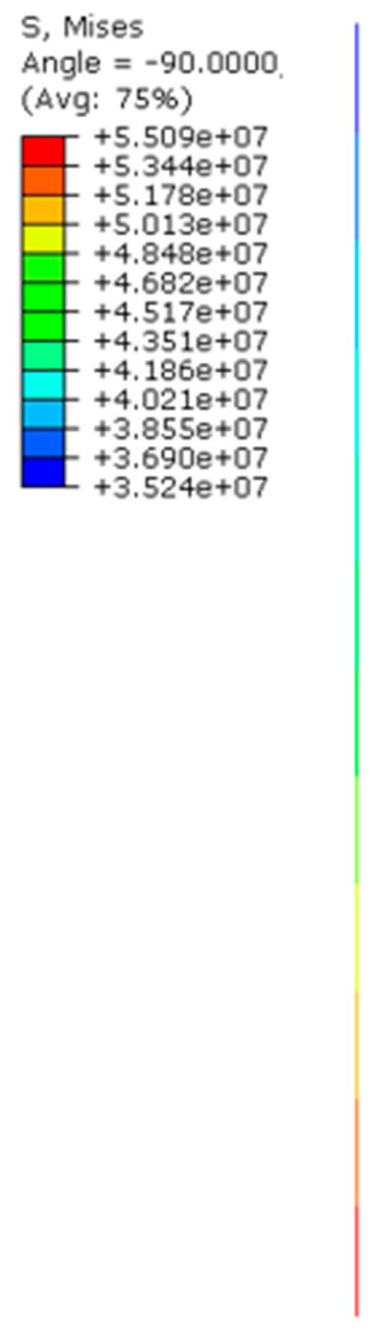 In the simulation, the torque applied to the bit (static loading) decreases the angular velocity while the rotating speed of the rotary table remains unchanged. Figure 11 and Figure 12 show the torque and stress distribution, respectively, of the drill string at a simulation time of 34 s in which the bit torque had a rectangular wave load amplitude (dynamic loading). When the simulation time reached 22.1 s, the peak torque increases. The torque of the drill string decreases gradually from the wellhead to the bottom hole, and distortion always occurs. Therefore, the torsion variable at the turntable is larger and the accumulated energy is higher. Because the torsion variable at the wellhead is much larger than that at the bottom of the well, greater stress will be produced at the wellhead, which will cause early failure of the drill pipe.