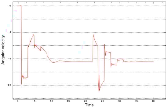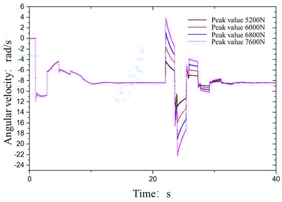 When the bit rotates under the condition of dynamic balance, the bit resistance suddenly increases, which will lead to the situation of first a decrease and then an increase in the bit’s rotational speed. As shown in Figure 13, when the simulation time is 22.1 s, this changes the original arrival time and the stabilization time is 2 s, and then decreases. The bit angular velocity decreasing rapidly from 8.37 rad/s in dynamic equilibrium to 4.2 rad/s indicates the presence of viscosity. Because the speed of the upper rotary table is constant, the drill string distorts and starts to accumulate energy while the drill bit still rotates. When the drill string energy is high enough, the drill bit speed suddenly increases to 13.1 rad/s, and then slippage occurs. Because the drill pipe is an elastic element, the drill bit still rotates at a variable speed after this, and it finally tends towards dynamic balance. Obviously, during the stage of bit slippage, its rotational speed is much higher than that in dynamic balance, which will inevitably cause the cutting teeth to suffer dynamic load impact. With the occurrence of SV, the cutting teeth become prone to premature failure.