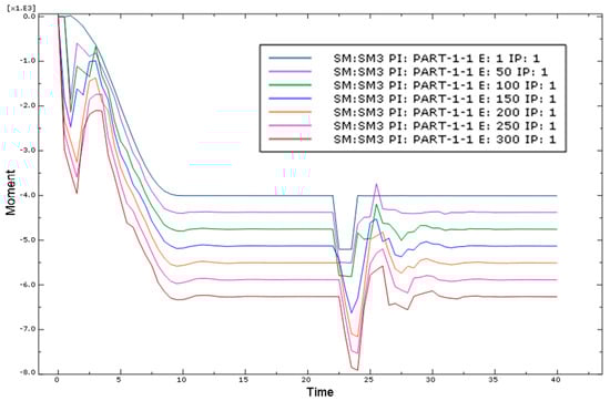 Under the same conditions, the torque changes of unit nodes 1, 50, 100, 150, 200, 250, and 300 at different positions of the drill string are shown in Figure 14. When the load changes suddenly, the torque borne by the drill string increases with the depth of the well, and it approaches from the bit to the bit. When dynamic balance is reached, the torque changes from the bottom hole. Therefore, when the drill bit penetration depth changes or the lithology abrupt changes lead to torque, the drill pipe will also bear greater torque, which will lead to SV, and the drill pipe will also bear cyclic variable stress.