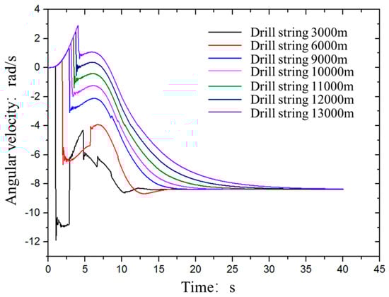 Figure 16 shows the change in bit speed under different drill string lengths. Because the active load (4000 Nm) is applied at the bit, the bit speed fluctuates during the initial stage of drilling. When the drill string is 3000 m, the rigidity of the drill string is sufficient, and the bit does not stop after the initial fluctuation. With this length of the drill string, the rotating speed of the drill bit is far less than the wellhead rotating speed (8.37 rad/s) for a long time. This is the elastic energy storage stage of the drill string. When the drill string reaches 11,000 m, the drill string still stops for a long time after the active load fluctuation (after 5 s), and when the accumulated force of the drill string becomes sufficient, it begins to break. Therefore, even if the bit resistance is constant, the SS phenomenon can occur provided the drill string is long enough.