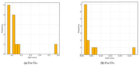 Key statistical parameters from Table 2 further elucidate that D60: mean = 0.140 mm, std = 0.145 mm, D30: mean = 0.048 mm, std = 0.074 mm, and D10: mean = 0.008 mm, std = 0.0079 mm. The high standard deviations relative to means, especially for D60 and D30, reflect significant variability in grain sizes across samples. This heterogeneity is visually apparent in the histograms (Figure 7a–e), which show right-skewed distributions, particularly pronounced for D60 and D30. Such variability suggests diverse sediment sources or differential sorting processes, which are common in alluvial environments downstream of dams.