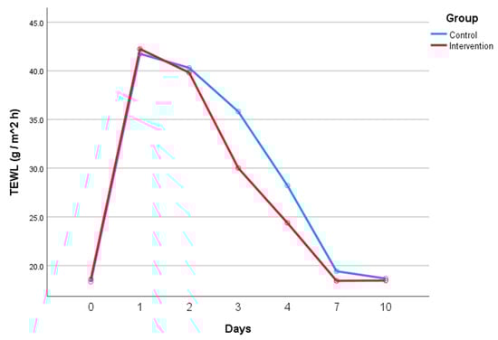 TEWL over the study period represented as two separate curves. One for the control group and a second for the intervention group.