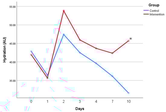 Hydration was also compared between the control and intervention groups, and also over time. As seen in Figure 2, both groups had similar baseline values (42.9 ± 8.7 vs. 42.0 ± 6.6 arbitrary units, control and intervention), and both groups experienced a sharp hydration-value decrease after SLS irritation (36.4 ± 11.1 vs. 35.6 ± 11.6 arbitrary units, control and intervention). While the control group’s hydration values recovered to the baseline values, the group that used the cream had its hydration values increase over baseline values. Moreover, the use of the cream was shown to keep skin hydrated for a longer period, while the control group had its hydration values decrease again after some time. On day 10, there was a significant difference between the hydration values of the intervention (45.7 ± 12.4 arbitrary units) and control groups (31.6 ± 12.3 arbitrary units) (p < 0.05). Respondents’ skin was more hydrated when using the cream, compared to not using it.
