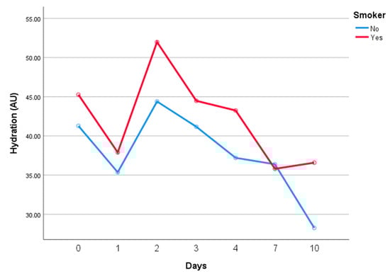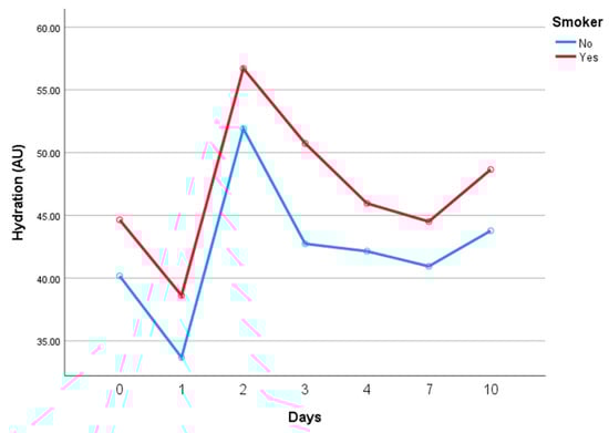The same comparison was conducted in the intervention group and the result was similar, as seen in Figure 4. There was no significant difference between the hydration values of smokers and non-smokers for the period of the study. Surprisingly, smokers had higher hydration values at day 10, but the difference was not significant (43.8 ± 10.9 vs. 48.6 ± 14.5 arbitrary units, control and intervention). In this study, smoking did not interfere with the hydration values of either group.