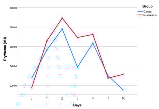 Erythema values over the study period. Comparison between control and intervention groups.
