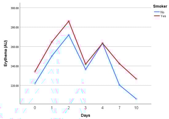 Erythema values over the study period. Comparison between smokers and non-smokers in the control group.