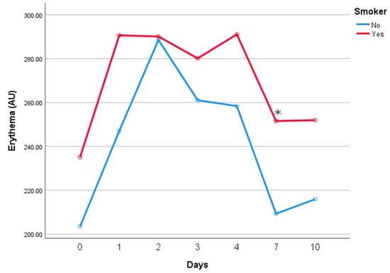 Erythema values over the study period. Comparison between smokers and non-smokers in the intervention group. * Paired Samples t-Test.