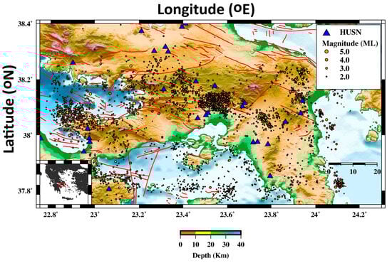 - University of Athens. Hellenic Seismological Network, University of Athens, Seismological Laboratory [Data Set]. International Federation of Digital Seismograph Networks. 2008. Available online: https://www.fdsn.org/networks/detail/HA/ (accessed on 31 March 2024).